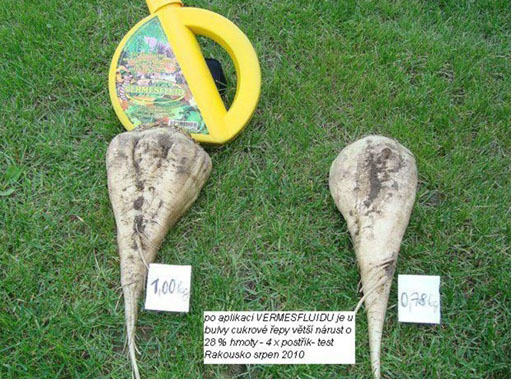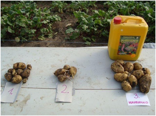 The principle of VERMESFLUID effect consists in ability of stimulating matters contained in it to increase utilisation and acceptability of nutrition matters from the earth. VERMESFLUID is a result of long-term development and practical application not only in agricultural large-scale production, but also by smaller farmers and in a hobby gardens. Very good effects on yield and quality of the plants were fully confirmed by users. An original prescription is in ownership of the inventor and manufacturer, received Czech and Austrian certificates.2. Application for field vegetables